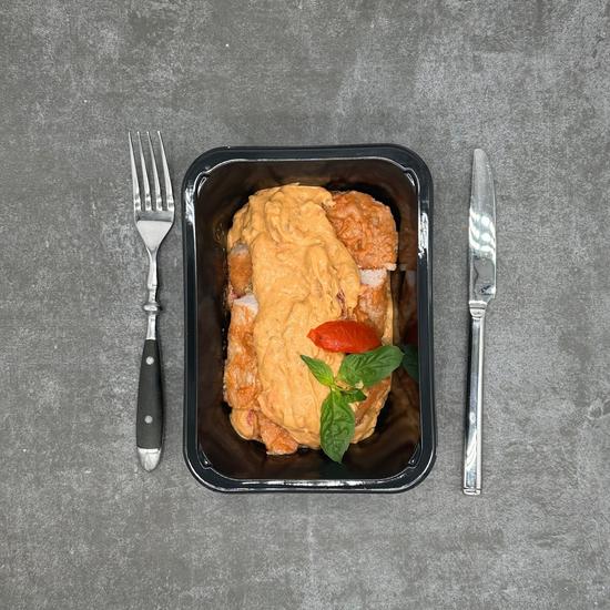 Onze kalfslapjes in Portofinosaus is gemaakt van langzaam gegaarde kalfslapjes. Aangevuld met puntpaprika, teentje knoflook, zontomaten & basilicum in een Portofinosaus ( saus op basis van mascarpone en rijpe tomaten ).